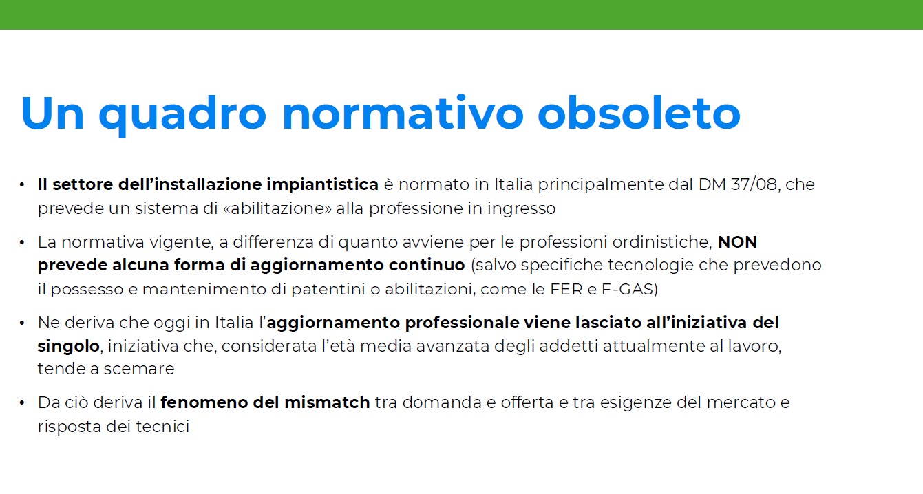 - l’attivazione di una Accademia pilota, che sperimenterà in condizioni reali corsi completi e micro-esperienze formative, coinvolgendo direttamente tecnici installatori;